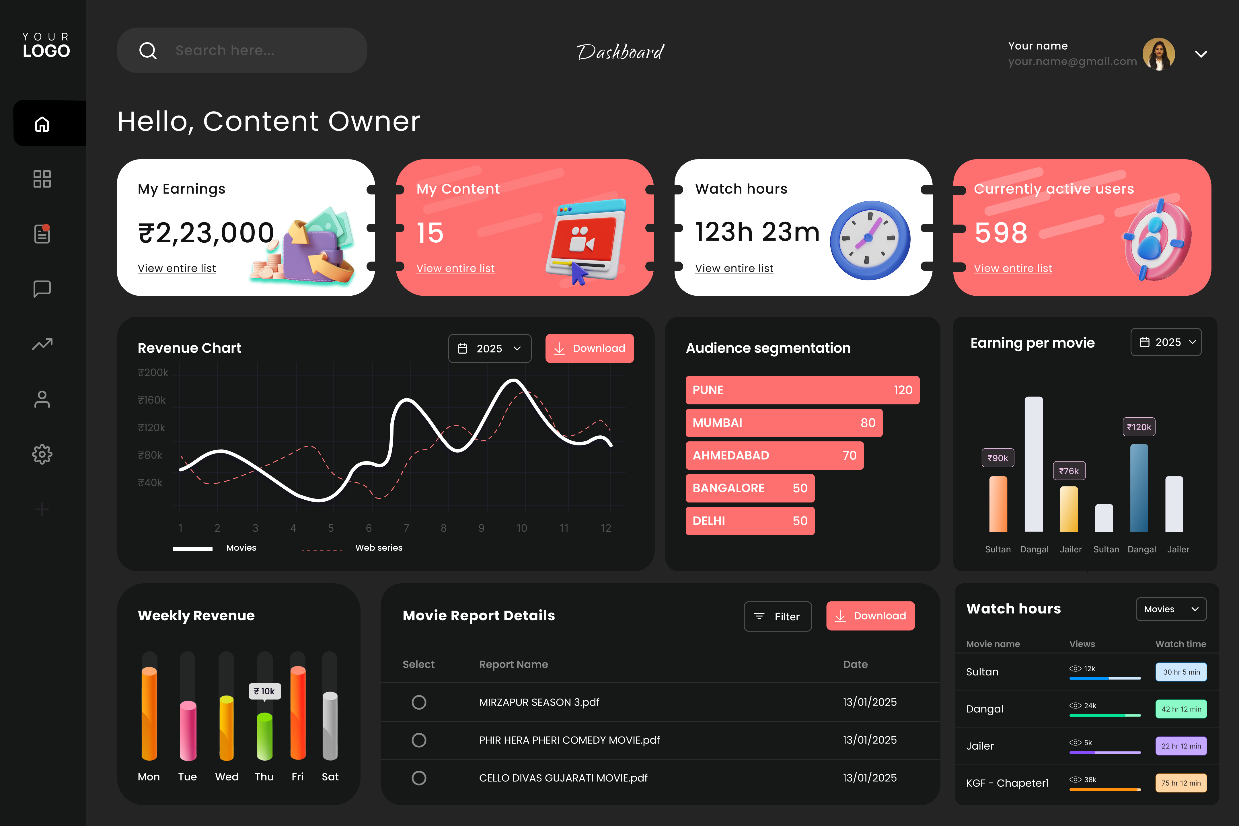 Access your dashboard anytime to track revenue, user activity, and most-watched content. Stay informed with real-time analytics right at your fingertips.